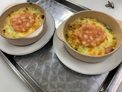 第1弾は、1年生チームが考案した「和風ポムインビジブル(じゃがいもとサーモンのミルフィーユ仕立て)」と、料理研究部伝統の「パイナップルたっぷり!ハワイアンロコモコ丼」。