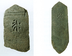 | 個人蔵及び中央1-8-31(郷土資料館) 慶応4年(1868年)、明治政府は「五箇条の御誓文」を発布した。一方庶民に対して「五蒡の掲示」を出し、江戸時代と同様に、一揆やキリスト教を禁止した。この制札は、道野辺の妙蓮寺わきの路傍に立てられたといわれている。 写真の制札は横103センチメートル、縦(最大)51.7センチメートル、厚さ3.5センチメートルの杉板製である。 昭和52年7月指定 | |