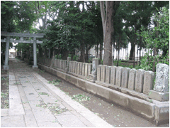 | 鎌ケ谷1-5 (大仏墓地内) 慶応4年(1868年)、江戸幕府の滅亡に反発した旧幕府軍の一部と鎮圧に向かった新政府軍とが、市川・船橋周辺で激しい戦いをした。その折、鎌ケ谷大新田付近で、新政府軍側の佐土原藩(現宮崎県宮崎市佐土原町)の士分1名(俗名 蓑毛次右衛門)と兵糧方1名(俗名 巳之助、兵糧を輸送した農民と思われる)が戦死した。ここにはその当時、佐土原藩の弔い料により建てられた墓石と明治19年(1886年)に新政府軍側の戦死者に対して千葉県の官費で建てられた墓石がある。 この新政府軍と旧幕府軍の戦争による死傷者の数はわかっていない。新政府側の兵士の墓はこのようの所々で確認できるものの、旧幕府軍の戦死者は、当時、墓石に名前を刻むことすら難しかったため、ほとんど確認できない状態である。しかし、下総地方には幕府直轄の牧場があったなど旧幕府軍に与する傾向があり、一部で脱走様と呼ばれる旧幕府軍兵士の墓と思われるものも存在する。 昭和47年3月指定 | |